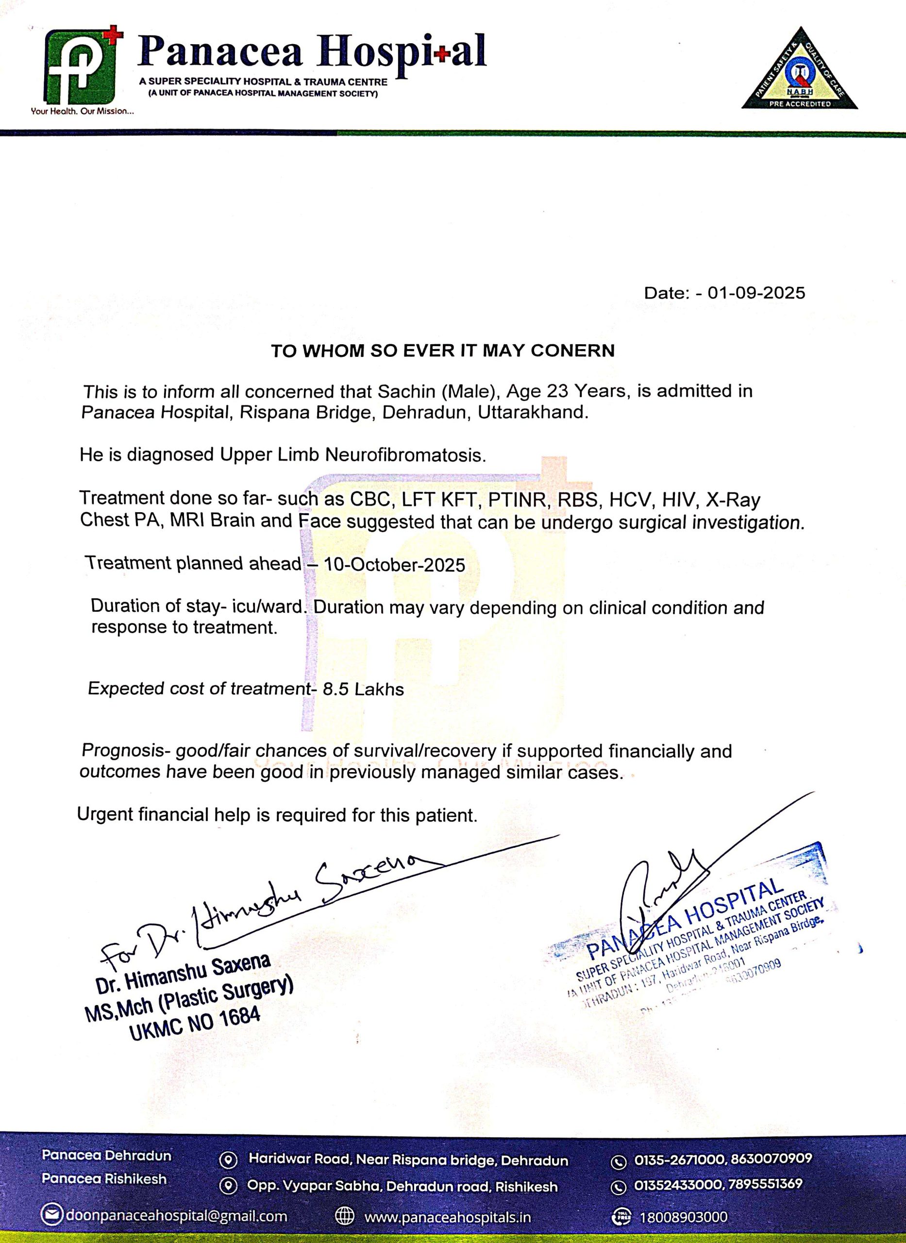 Now, doctors at Panacea Hospital, Dehradun, have given us some hope. They say that treatment is possible. But the cost is ₹8.5 lakhs, a mountain too high for my family to climb.