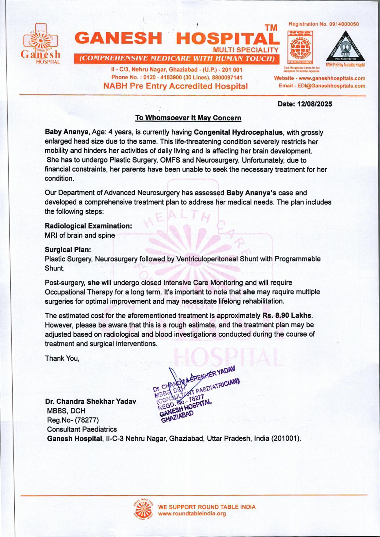 Recently, Ananya’s condition worsened, and she was admitted to Ganesh Hospital, Ghaziabad. The doctors gave her parents the harsh truth: unless she undergoes urgent surgery and full medical treatment, her chances of survival will keep slipping away. The estimated cost is ₹8.90 lakhs, an unimaginable sum for a man who earns ₹400 a day.