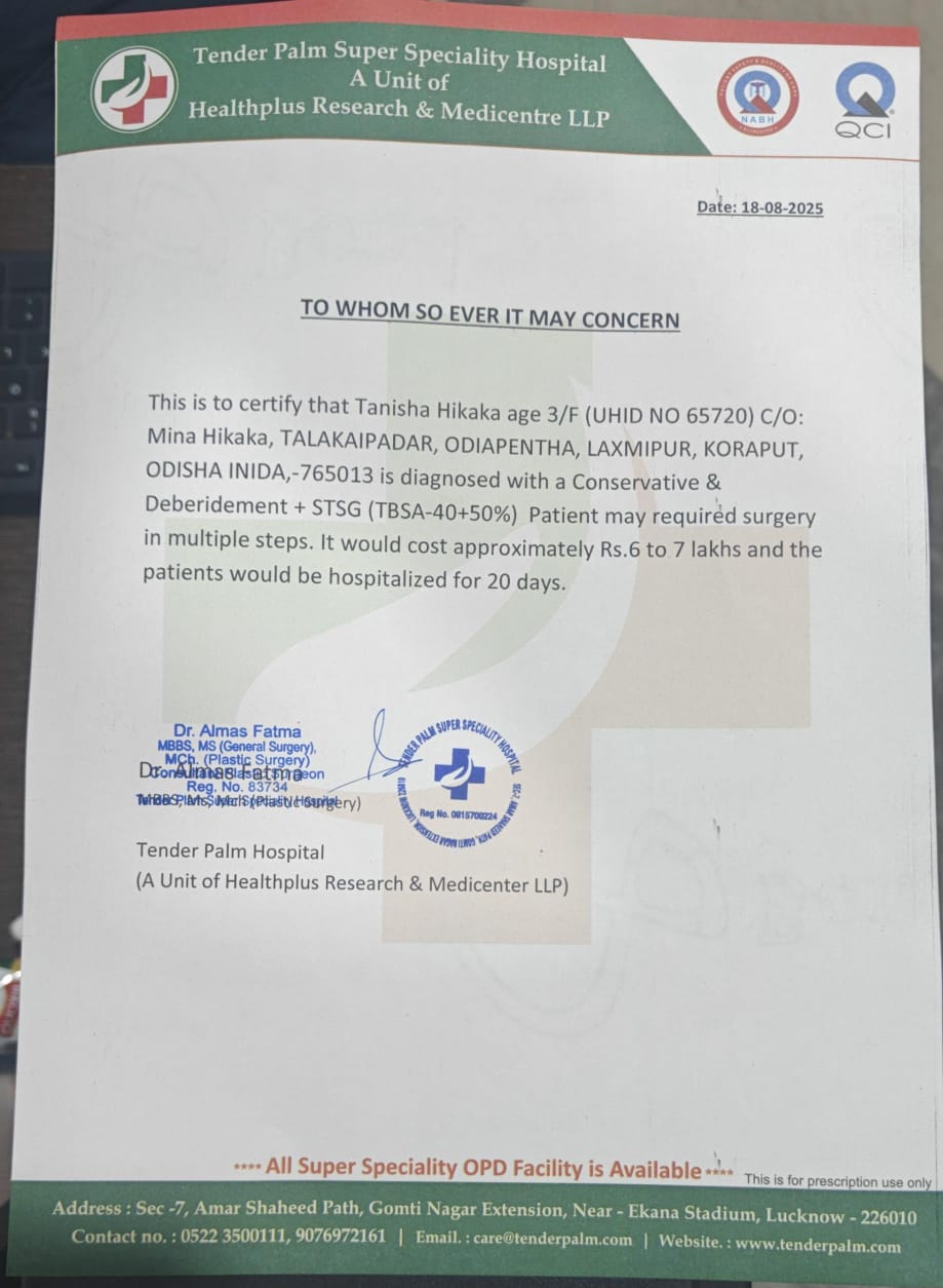 The doctors at Tender Palm Hospital, Lucknow,, where she is currently admitted, are doing everything they can. But her condition is serious and will need multiple surgeries, skin grafts, medicines, and months of care. The total cost of her treatment is estimated to be around ₹6–7 lakhs.