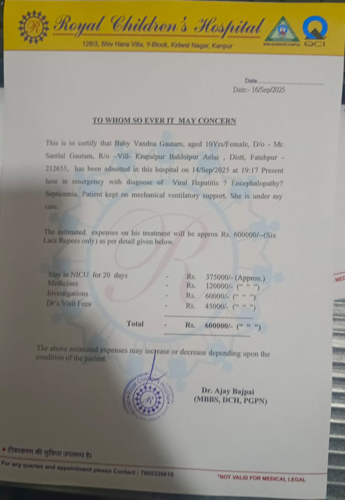 But now, doctors are asking for ₹6 lakhs for her complete treatment. For a poor man like me, this amount is beyond impossible. I feel broken when I see my daughter fighting for her life while I stand helpless, unable to arrange the money she needs.