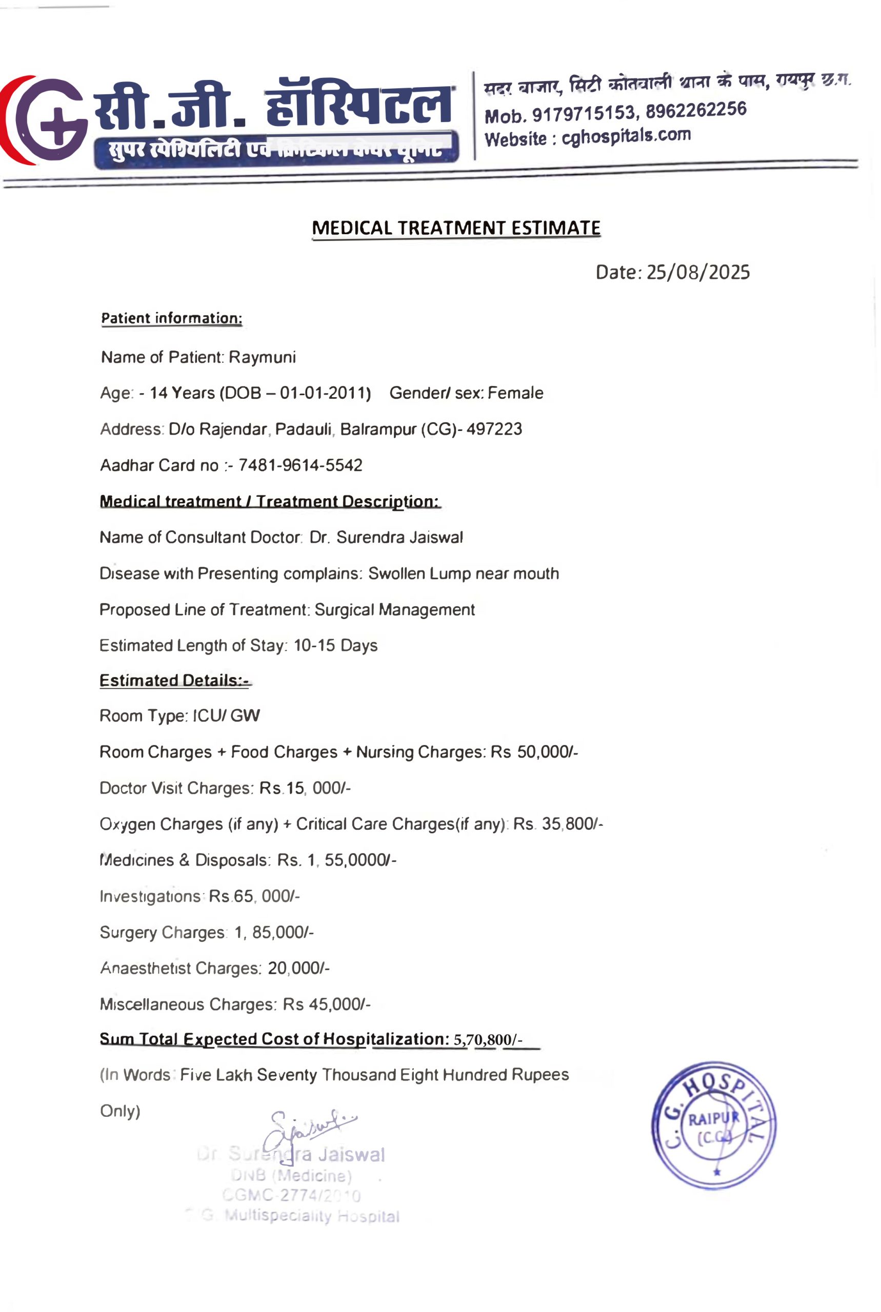 Now, the doctors at CG Hospital, Raipur, say that I need another major surgery. This time, it will cost ₹5,70,800. My father’s hands shook when he heard that number. He looked at my mother and said nothing, just quietly stepped outside. That night, I heard him crying. It was the first time I’d ever seen my father cry.
